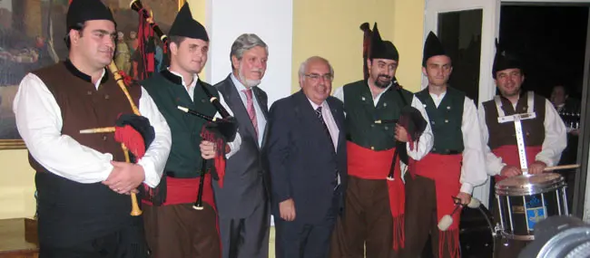 El presidente Areces y el embajador en México posan con el grupo de gaiteros del Centro Asturiano de México.