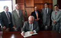 Vicente Álvarez Areces firma en el libro de honor del Centro Asturiano de Santo Domingo.