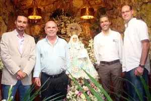 Guzmán Palacio Fernández, Luis Martínez Niembro, Jorge Noval Álvarez y Juan Carlos Fraga Niembro, tesorero del CAC, en la réplica de la Cueva de Covadonga.