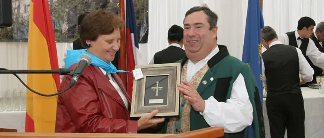 Ramos entrega una placa con el escudo de Asturias a Ramón Trespalacios, presidente del Centro de Valparaiso.