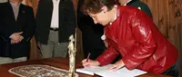 La consejera firma en el libro de honor del Centro Asturiano de Valparaíso.
