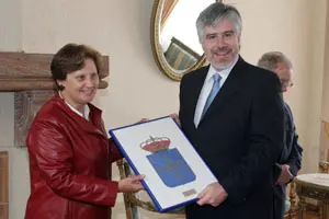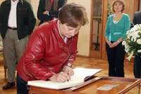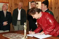 La consejera firma en el libro de honor del Centro Asturiano de Valparaíso.