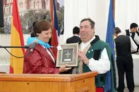 Ramos entrega una placa con el escudo de Asturias a Ramón Trespalacios, presidente del Centro.