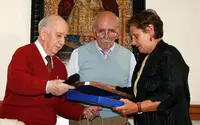 Venancio Blanco –acompañado de María José Ramos y Begoña Serrano- recibe en nombre de la institución un presente del gobierno asturiano.