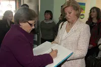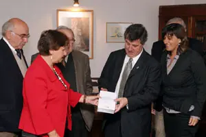Ana Rivas firmando en el libro de visitas del Centro Asturiano de San Fernando.