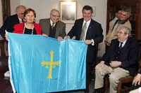 La consejera de Presidencia entrega una bandera asturiana al presidente del Centro.