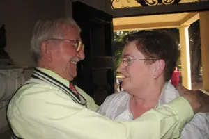 Teresa Ordiz, recibida por un asturiano a su llegada al Hogar Español.