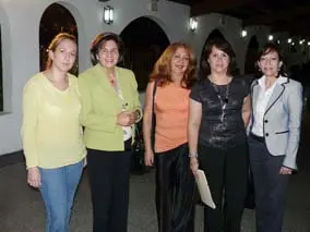 Karina Fernández de Barreiro, Conchi Amador, presidenta de la Asociación Virgen del Pino; Doris Aguilar, Mariela Valladares de Santana, coordinadora de ‘Balcón Canario’; y Josefina Benítez, secretaria general de Fedecanarias.