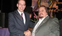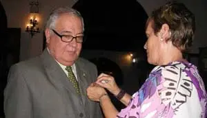 Francisco Javier Lorenzo impuso un botón a Carmelo Hernández, presidente del Club Social Archipiélago Canario, como miembro fundador de Fedecanarias.
