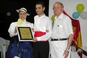 Entrega de reconocimiento a Jonathan Santos, folclorista gomero, por parte de Maurilia Cabrera y Vicente Barroso.
