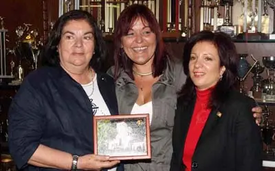 Guillermina Hernández recibe una fotografía conmemorativa del HCV, de manos de la presidenta de la entidad, Arcilia Díaz, en compañía de la directora general de la Ciudadanía Española en el Exterior, Pilar Pin.