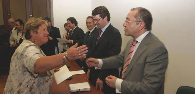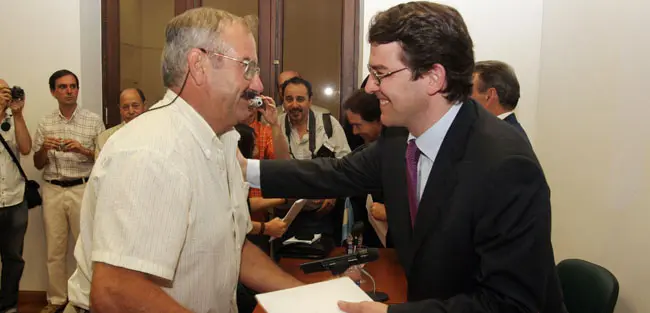 Mañueco entrega la documentación a otro de los beneficiarios.