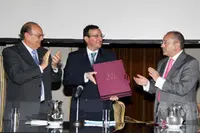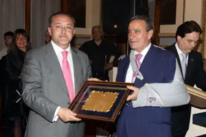 Félix Colsa recibe una placa de manos de Pedro Bello.