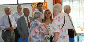 Isabel Carrasco recibe el saludo de los mayores, durante su visita al Centro de Día de la tercera edad.