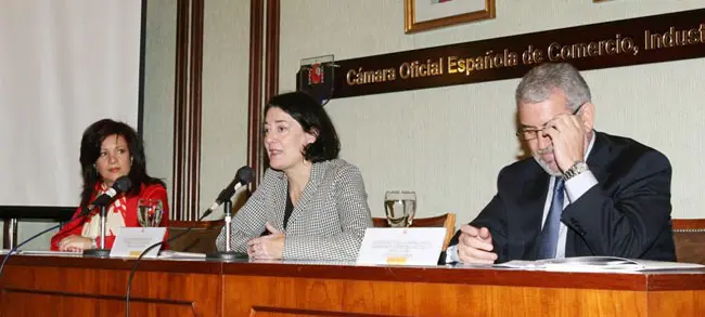 Anna Terrón -flanqueada por Pilar Pin y Manuel Barros- durante su intervención en la Cámara de Comercio.