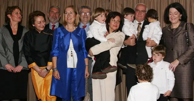 Manuel Ramos -rodeado de sus nietos- posa con la diferentes autoridades.