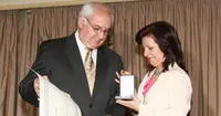 Pilar Pin entrega a Manuel Ramos la Medalla de la Emigración y el diploma acreditativo.