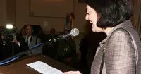 Anna Terrón lee la resolución mediante la cual se le otorgó a Manuel Ramos la Medalla de la Emigración.