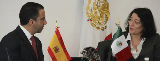 La secretaria de Estado de Emigración durante la reunión con el secretario de Trabajo y Previsión Social, Javier Lozano.
