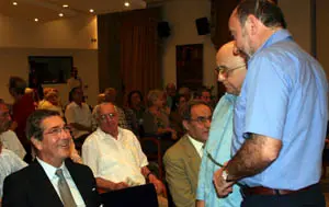 El director de Galicia en el Mundo, Luis Vaamonde, saluda al embajador Manuel Cacho.