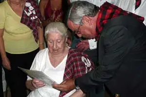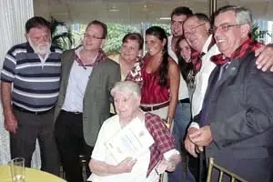 Ascensión Villanueva, junto a su familia al momento de recibir la ‘Huella Aragonesa’ por parte del Antonio Pargada y Carlos Ramos.