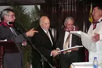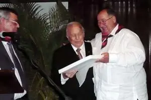 Carlos Ramos Royo y Antonio Pargada Gil, presidente y secretario general de la Agrupaciùn Aragonesa de Venezuela, entregan una placa de reconocimiento a JosÄ MarÆa Ariûo Espada, ex presidente de la entidad.