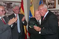 Ariño, visiblemente emocionado, recibe el reconocimiento de manos de Manuel Herrera Castilla, en presencia de Concha Allende y de Eugenio González de la Vega.