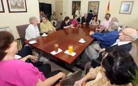Pilar Pin -flanqueada por Manuel Luis y Eduardo Pahíno-, en la reunión con los \'niños de la guerra\'.