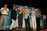 María Dolores de Cospedal y Alfredo Prada, junto a miembros del PP en Suiza, durante el acto en Lausanne.
