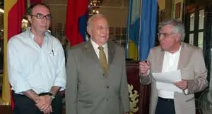 El presidente del CRE –dcha.– alaba la figura de Ariño Espada –centro– en presencia del secretario del organismo asesor consular.