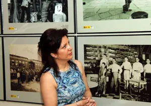 La directora general observa alguna de las fotografías expuestas.