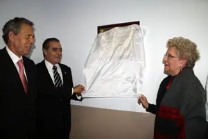La doctora Espisua, Pedro Bello y Rafael Estrella, destapando la placa.