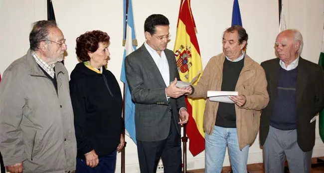 Arturo Pérez entrega la misiva al ministro consejero, en presencia de Francisco Lores, Mª Teresa Michelón y Adonis Pampín.