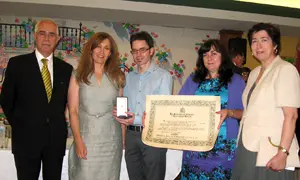 Aurelio Miras, Mª Dolores González, Leonardo González Feijóo, Julia Gil, presidenta predecesora de la Escuela; y Elena López, directiva del Club Hispano.
