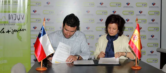 Juan Eduardo Faúndez, director del INJUV, y Pilar Pin firman el protocolo de colaboración
