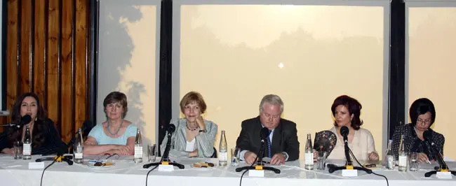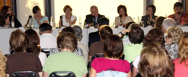 Pin en la mesa presidencia del Foro sobre políticas de integración y el papel de las mujeres descendientes de españolas en Chile.
