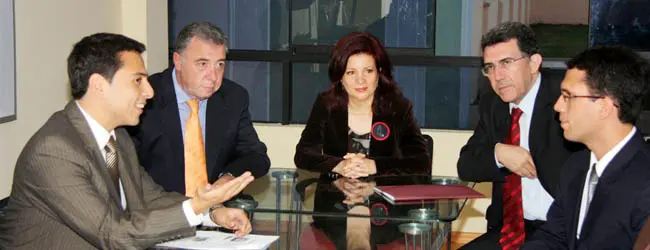 Pilar Pin, durante su reunión con el presidente de la Sociedad Española de Beneficencia de Lima, Juan González, y el consejero laboral, José Vallés.