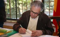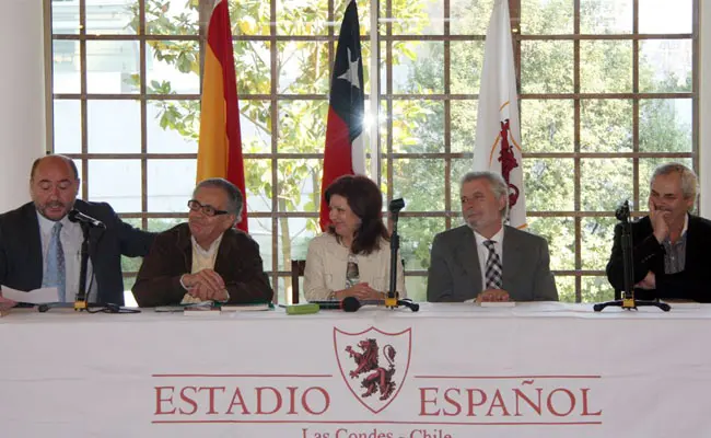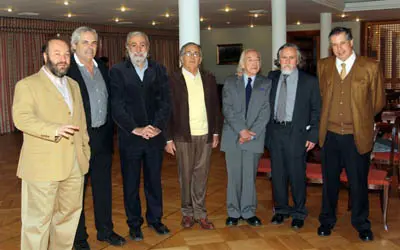 Edmundo Moure, con un grupo de intelectuales chilenos, antes de iniciarse el acto.