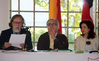 Edmundo Moure -flanqueado por Luis Vaamonde y Pilar Pin-, durante su intervención.