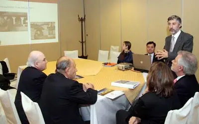 El cónsul general, Víctor Fagilde, escucha la explicación del presidente del Estadio Español sobre los daños del terremoto.