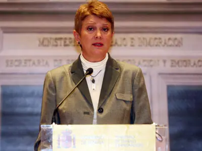 La secretaria de Estado de Inmigración y Emigración entrega su placa a Manuel Maya.