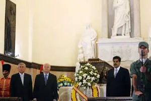 Moratinos, en la ofrenda floral en el Panteón Nacional, ante el sarcófago donde reposan los restos del Libertador, acompañado del ministro de Exteriores de Venezuela, Nicolás Maduro –dcha.–, y el embajador Dámaso de Lario.
