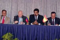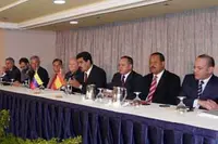 El embajador Dámaso de Lario; el ministro de Comercio, Eduardo Samán; Alfredo Bonet, secretario general de Comercio Exterior del MAEC; Alí Rodríguez Araque, ministro de Economía y Finanzas; el ministro Moratinos y su homólogo, Nicolás Maduro;