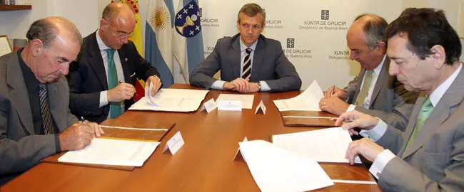 Francisco Solla, Santiago Camba, Alfonso Rueda, Rafael Gil y José Vila Alén, durante la firma del convenio.