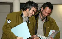 Martín Iglesias y Humberto Vázquez, directores del Proyecto Expedición Bicentenario, leen las carpetas con los sueños de los niños del colegio.