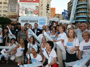 Simpatizantes del PSOE reparten rosas con el cartel del partido en lo alto de un edificio de Buenos Aires.