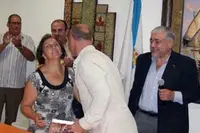 El presidente del Centro Gallego de Puerto La Cruz, Manuel Sinde Porto, le impuso a Santiago Camba el ‘Botón de Oro’ de la entidad.
