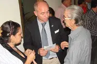 Camba, entre Alberto González –de pie–, y José Luis Ferrera, vicepresidente y presidente del Centro Cultural Cervantes de El Tigre, en la visita a esa entidad.