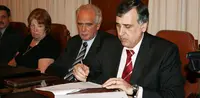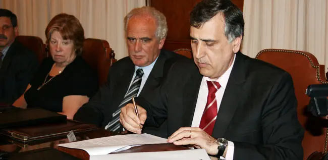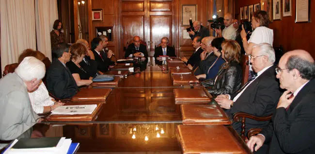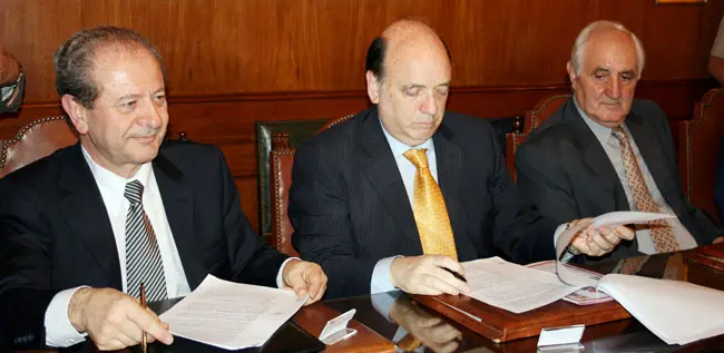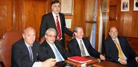 Camba, junto a directivos de Ospaña, Simeco y del Centro Gallego de Buenos Aires, tras la firma del convenio.