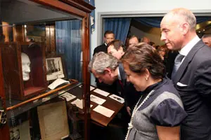 Farjas y Rueda observan detalles de una exposición sobre Castelao en el Centro Galicia.